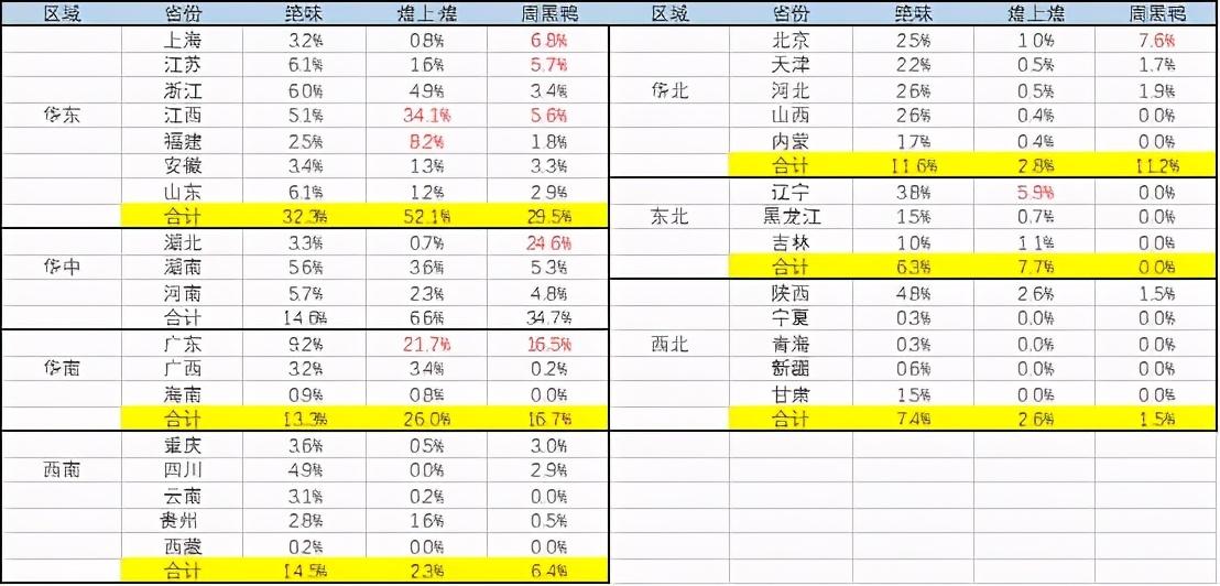绝味的店面全国均匀分布,煌上煌主要集中在江西、广东等,周黑鸭则主要集中在湖北、广东等。
