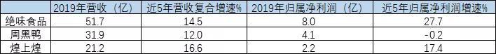 2019年绝味/周黑鸭/煌上煌分别实现收入 51.7/31.9/21.2亿元,2014-2019年收入复合增速分别为 14.5%/12.0%/16.6%,三家公司营收均成长稳健。
