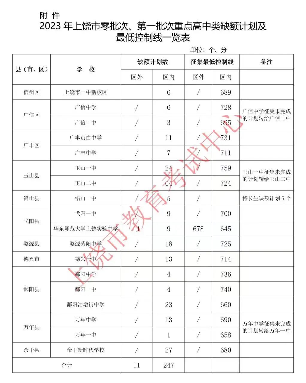 附件:2023年上饶市零批次、第一批次重点高中类缺额计划及统招最低控制线一览表