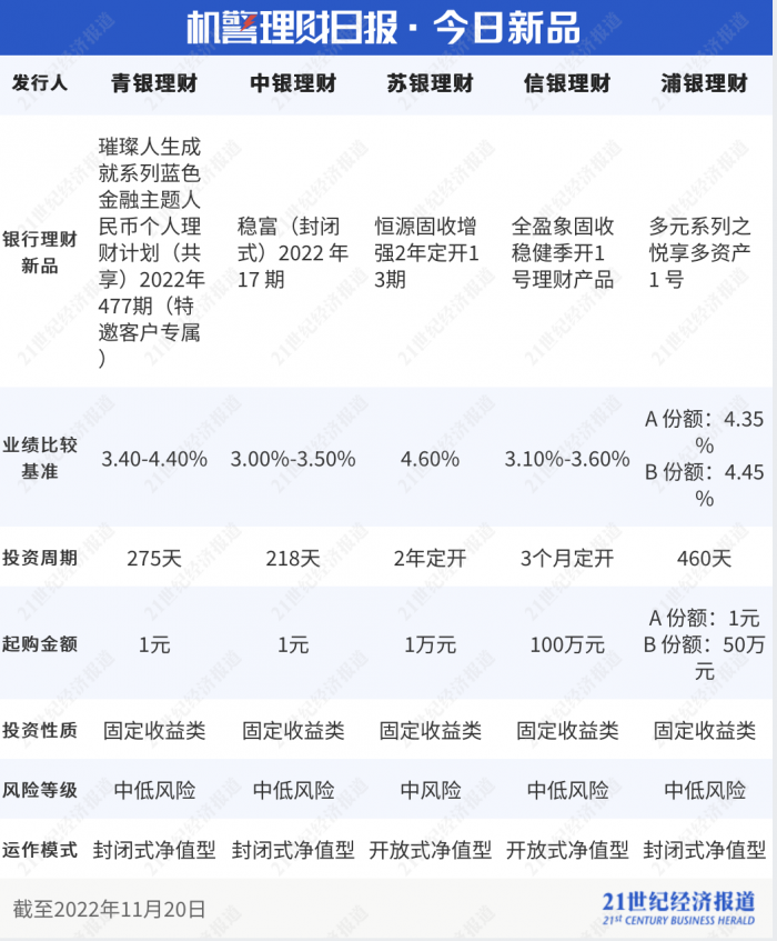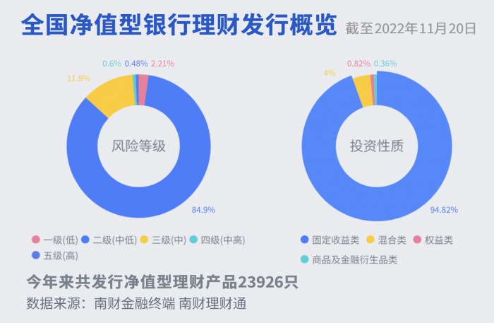 据南财理财通数据,截至2022年11月20日,今年以来,全国发行净值型银行理财产品23,926只。其中,一级(低风险)产品占比2.21%,二级(中低风险)产品占比84.9%,三级(中风险)产品占比11.8%,四级(中高风险)产品占比0.6%,五级(高风险)产品占比0.48%。