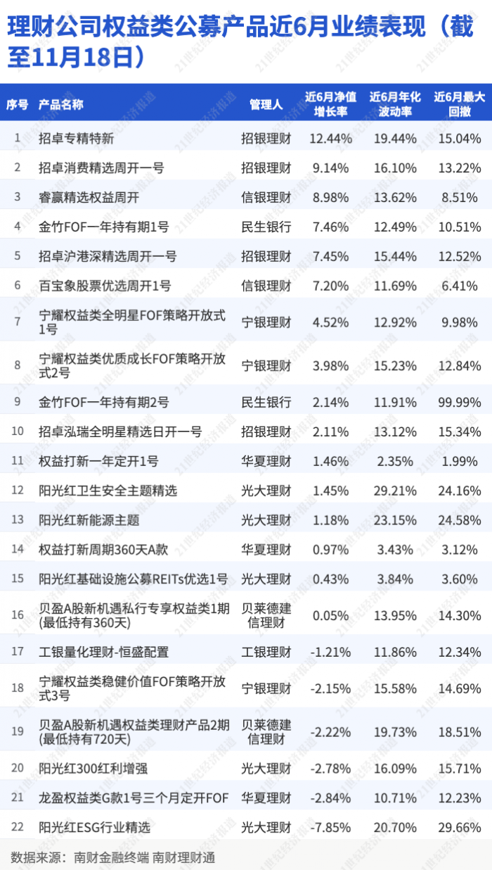 从本期理财风云榜来看,在22款成立满半年的权益类公募产品中,有16款产品近6月收益为正,6款产品近6月涨幅超过5%,1款产品近6月涨幅超过10%。近期,A股市场有所反弹,自10月份到达低点后呈震荡上行走势,沪深300跌幅收窄,近6月下跌5.10%,创业板指近6月收益为正,微涨0.87%。