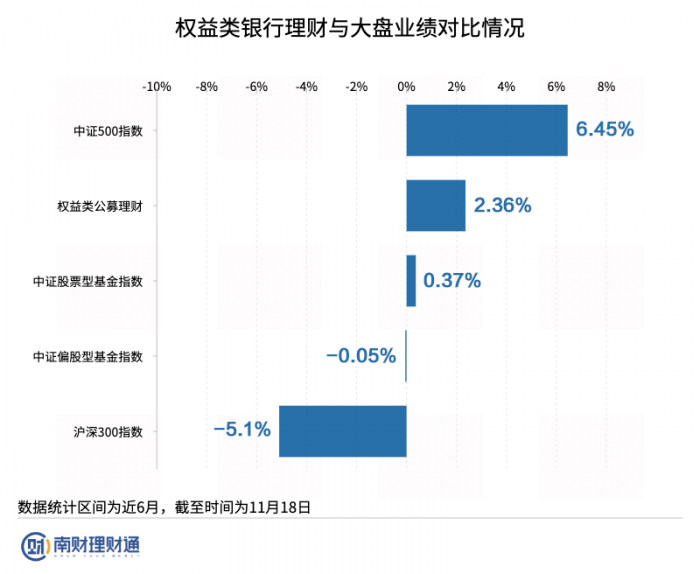 具体数据上,截止记者发稿,权益类银行理财有不少产品净值逐步修复,录得正收益。对比来看,权益类银行理财和公募基金均跑赢沪深300。22款权益类公募理财产品近6月净值增长率均值为2.36%,跑赢股票型基金0.37%的收益率和偏股混合型基金-0.05%的收益率。